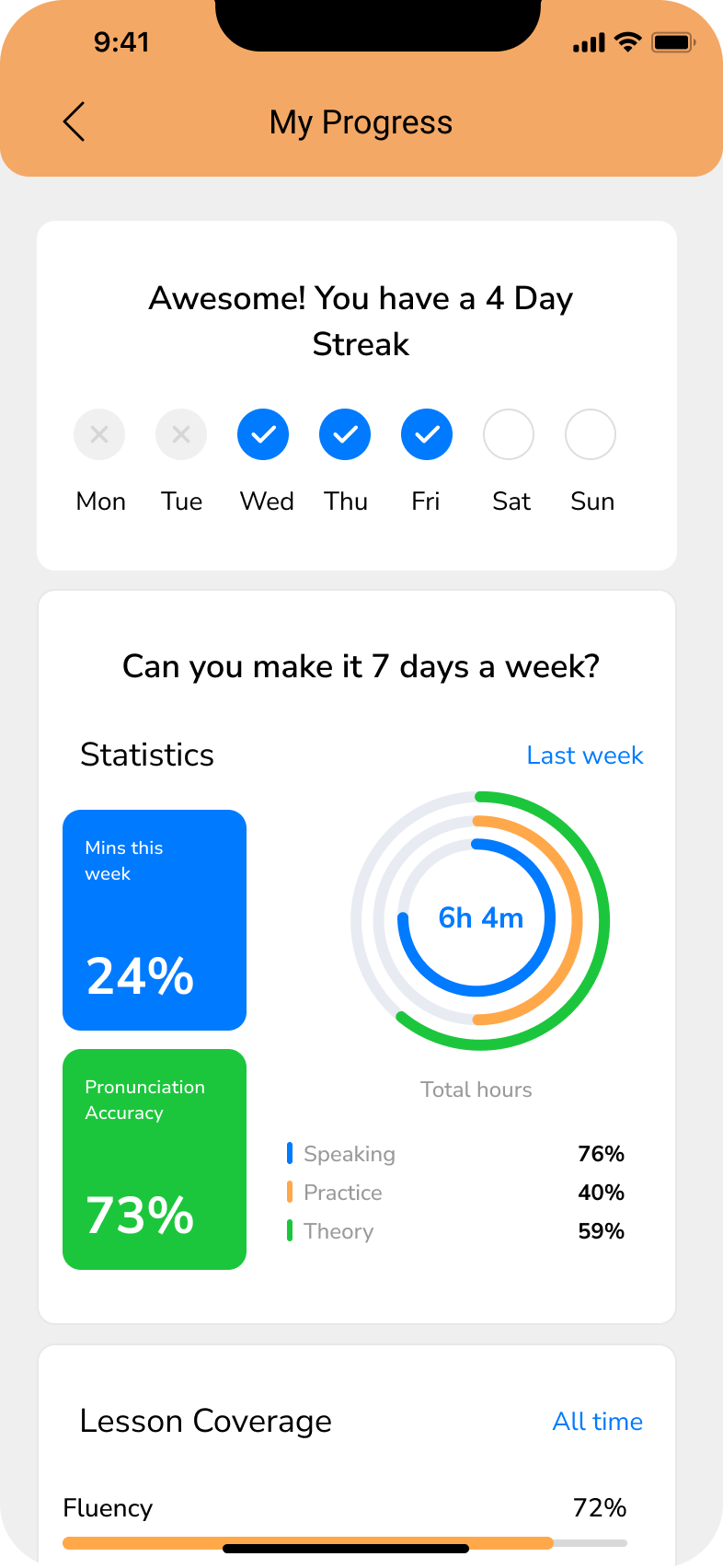 Learning without the limitations of fixed class times. Do daily session instead of weekly ones - at a time and duration of your choice!